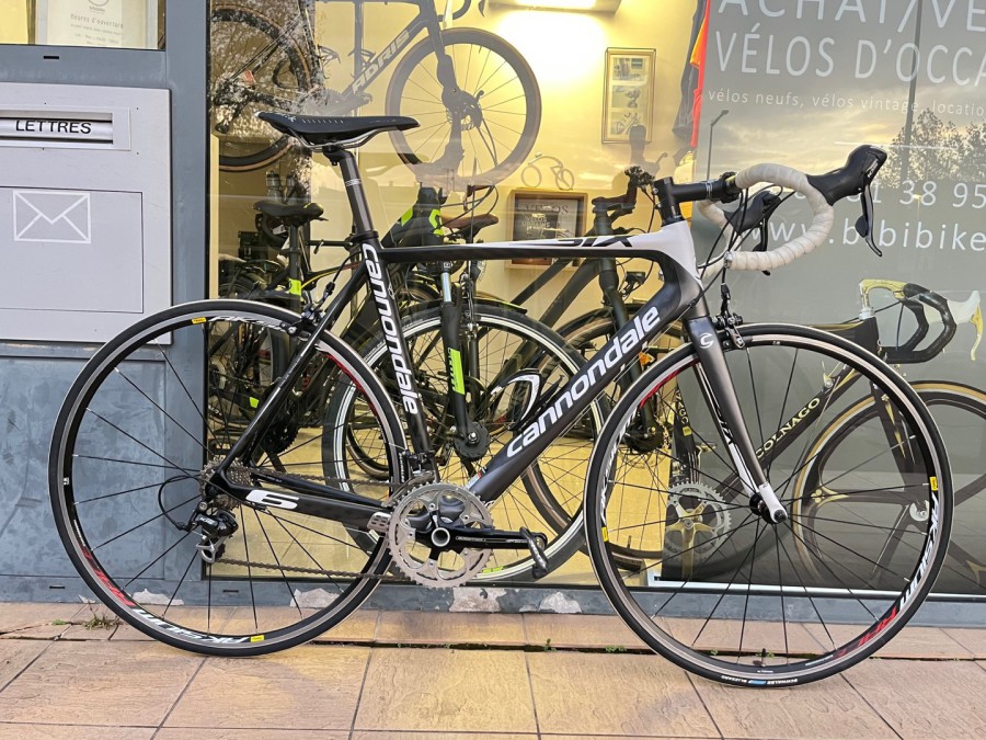 Vélo de course CANNONDALE SIX carbone - Taille L 56 - 2x10 vitesses - État visuel: 9/10 - Vélo de course tout carbone très léger et fiable avec équipements Shimano 105 dans un état très propre. Idéal pour cyclistes à la recherche d'un vélo de course léger et réactif - Prix: 890€ (790€ avec les aides Toulouse Métropole) + 10€ marquage vélo