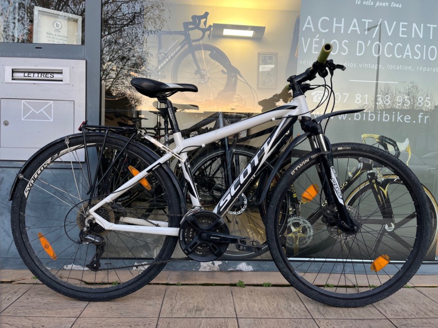 Vélo VTC SCOTT SPORSTER 50 - TAILLE S/M (1m60-1m75) - 3x8 vitesses - État visuel: 7/10 - Vélo polyvalent et solide de la célébre marque américaine SCOTT. Equipé de garde-boues, porte-bagages arrière et freins à disque hydrauliques. Idéal pour personnes à la recherche d'un vélo polyvalent et fiable - Prix: 280€ (180€ avec les aides Toulouse Métropole) + 10€ marquage vélo