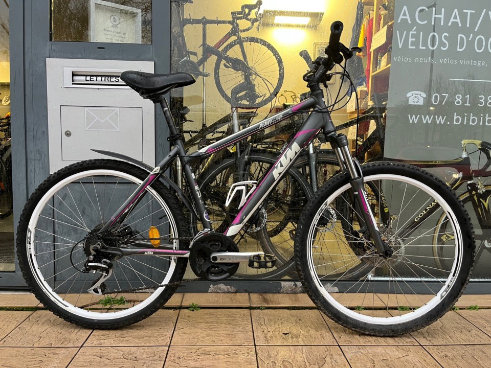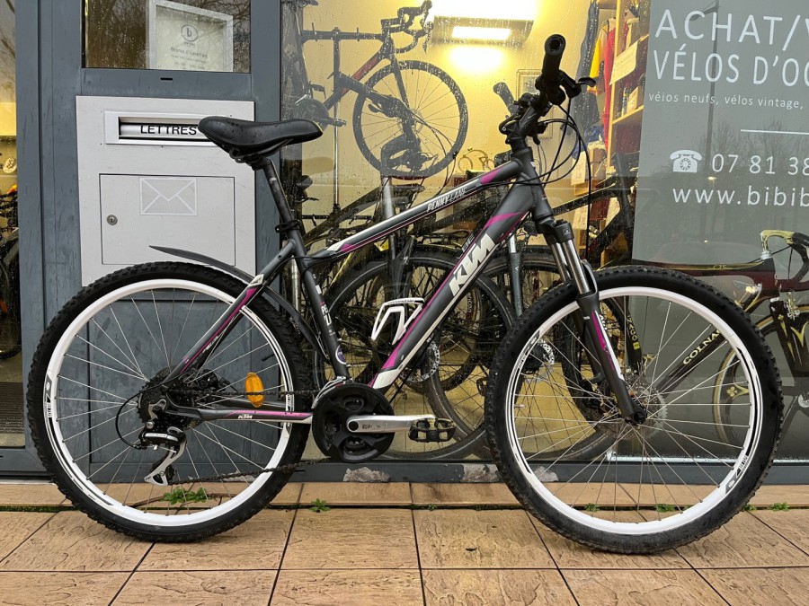 Vélo VTT KTM PENNY LANE - TAILLE M (1m65 -1m75) - 3x8 vitesses - État visuel: 8/10. Vélo solide et fiable. Equipements Shimano, freins à disque, suspension avant et jantes double paroi. Idéal pour tout type de terrains - Prix: 250€ (150€ avec les aides Toulouse Métropole) + 10€ marquage vélo