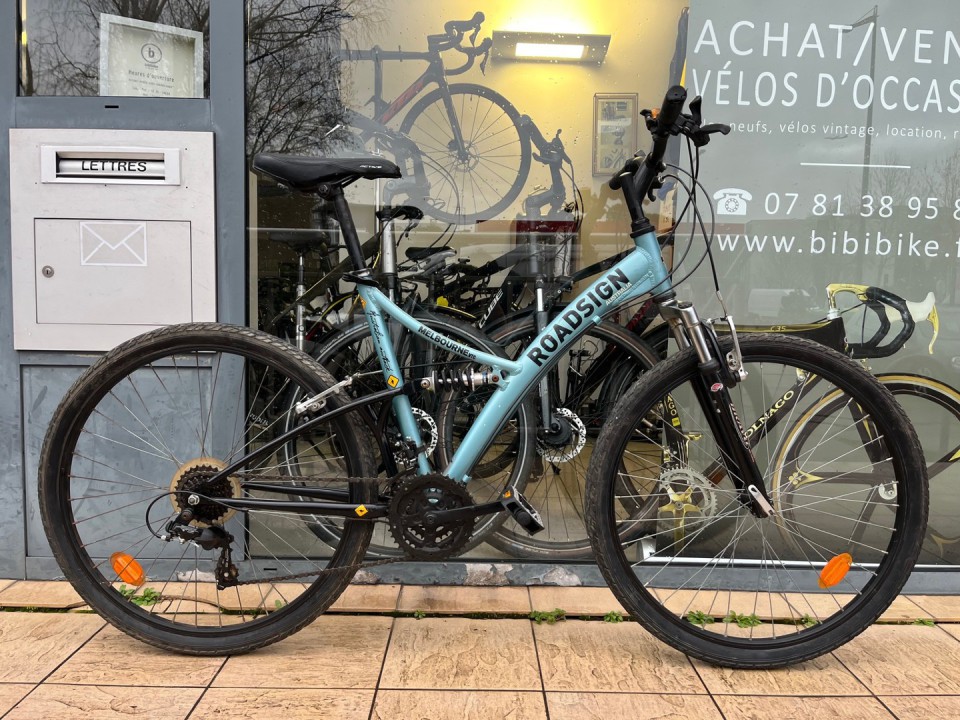 Vélo VTT tout suspendu ROADSIGN - TAILLE M (1m65 -1m75) - 3x7 vitesses - État visuel: 7,5/10. Vélo tout suspendu avec équipements Shimano. Idéal pour tout type de terrains - Prix: 120€ (72€ avec les aides Toulouse Métropole) + 10€ marquage vélo